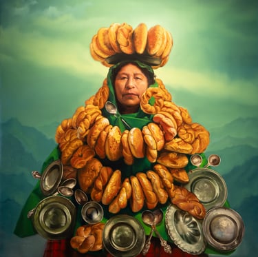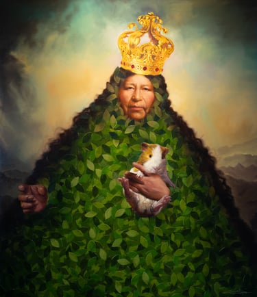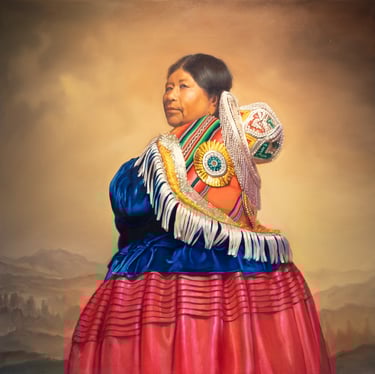 En este dialogo con mitos de occidente la exposición Sin tiempo albergo la obra “Sagrada venus”, que fue parte de la exposición en Zona Maco. En la misma vemos el nacimiento de la diosa en una gigantesca concha marina, donde la señora Amalia yace durmiendo. Acaso a orillas del lago Titicaca. El nacimiento de un icono de occidente generalmente mirando al espectador dio paso al cuerpo de la chola paceña contemporánea durmiendo en los Andes.