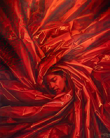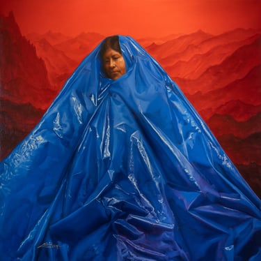 El plástico colonizando la vida de forma gozosa en la misma exposición nos ofreció a su modelo Amalia, la madre del artista, vestida con plásticos rojos, en otras piezas verdes, o azul, en azul andino como menciona Cristian. La mamá de Cristian personifica a la Pachamama o Madre Tierra envuelta en plástico en escenas que no implican sujeción sino un estadio de próximo a la tranquilidad e incluso el goce.