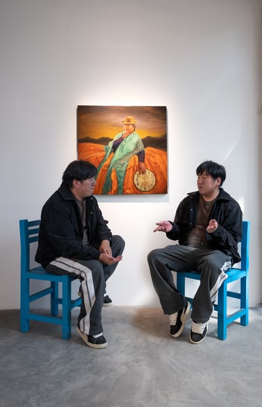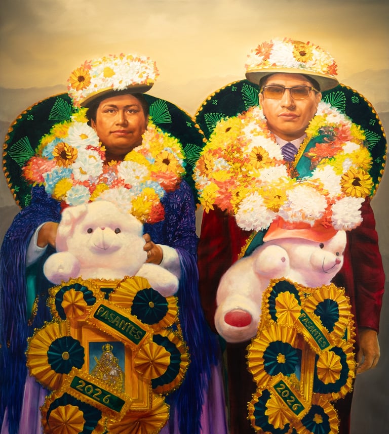 Ambas piezas Barroco mestizo y Colonizador con fondos indefinidos, extemporáneos cohabitando y operando como síntoma de la condición colonial de Bolivia, condición que se torna ineludible en las conversaciones este primer cuarto de nuestro siglo donde Cristian se posiciona e interroga al colonizador y al colonizado. En un posteo de su cuenta de Instagram Cristian cita a Eduardo Galeano sobre la condición del colonizado en tanto “el colonizado es un sub-hombre, capaz de superstición pero incapaz de religión, capaz de folclore pero incapaz de cultura: el sub-hombre merece trato subhumano, y su escaso valor corresponde al bajo precio de los frutos de su trabajo. El racismo legitima la rapiña colonial y neocolonial, todo a lo largo de los siglos y de los diversos niveles de sus humillaciones sucesivas”.