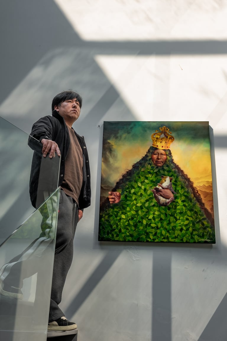 Fue con el exposición Mama plastic-pachamama, Repensar y entender nuestro tiempo, del respeto y el valor de la madre tierra... donde me encontré con Cielo dorado, cerro de plata una obra alusiva al famoso cuadro la Virgen Cerro, donde la virgen y el Cerro Rico de Potosí se unen en una forma triangular que representa, al mismo tiempo a la virgen y a la montaña. La montaña concebida como sagrada con la idea de madre tierra, vientre y fertilidad. La montaña y la virgen fruto del sincretismo resignificadas como la Pachamama. En esta ocasión, para Cristian la tierra y los dones del Cerro Rico que fueron la plata dio espacio al plástico plateado y brillante.