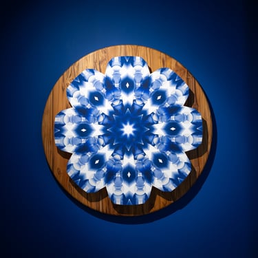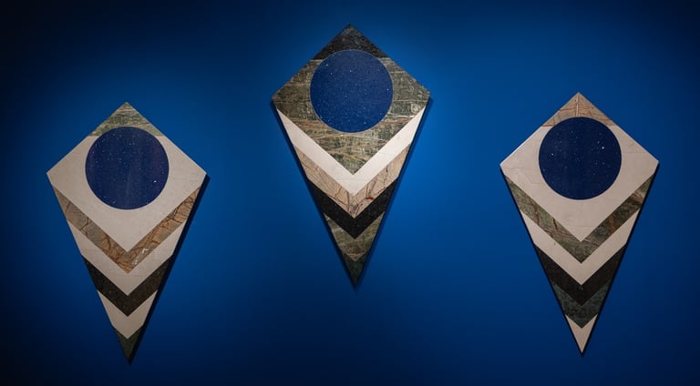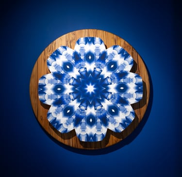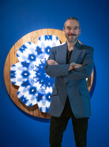 His constant color is the Overseas Blue, a shade the artist feels connected to both the stillness of the sea (the unconscious) and the freedom of the sky (the higher mind). This is a language of the spirit, often layered with the Sacred Geometry present in his Beyond Matter series. Other new mirror pieces cease to be mere reflective surfaces, transforming into a threshold that returns us to our own presence by touching the SELF, weaving the viewer’s individuality into the universal embrace of the work.
