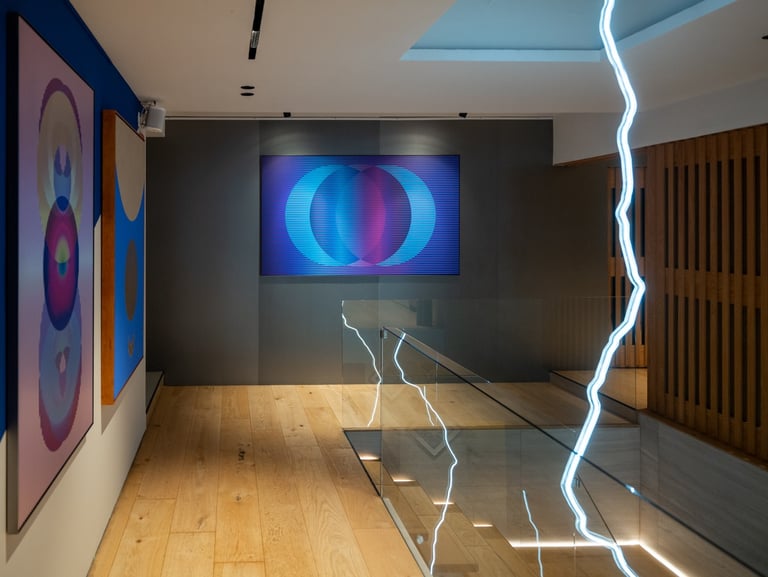 The choice of Casa Hotbook as a setting is both crucial and poetic. This architectural sanctuary—woven from texture, design, and light—becomes the ideal counterpoint to Élan’s reflective universe. His works, tracing an interior cartography of the self, inhabit every crevice of the space, transforming walls into silent witnesses of introspection.